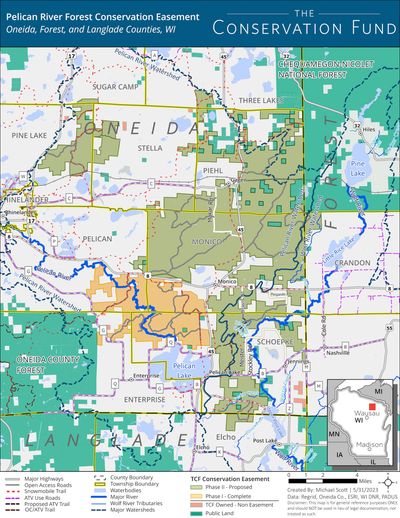 "The Pelican River Forest Conservation Easement project represents a once in a lifetime opportunity to protect 56,000+ acres of working forestland in Wisconsin. Current owner, The Conservation Fund, is partnering with Wisconsin Department of Natural Resources which will use funding from the Knowles -Nelson Stewardship Program to secure a conservation easement to protect the largest remaining unprotected private working forest in Wisconsin.