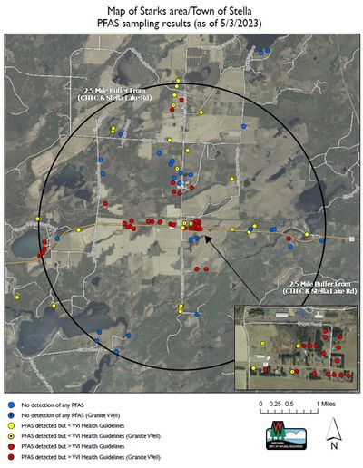 "The DNR expanded private well sampling to an additional 56 full-time residences and two summer camps within 2.5 miles of the Stella Town Hall. As of May 3, 2023, a total of 50 wells were sampled within the 2.5-mile expanded area. Of those, the DNR sampled 43 full-time residences, and three residences sampled their own well prior to being contacted by the DNR. Of the 50 private wells sampled: