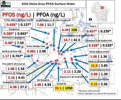 Here is DNR's newest and most helpful link to the recent surface water testing. Maps and tables with actual test numbers. You will want to see this! Stella and Rhinelander Area SW PFAS Results 2023 - Maps and Tables (wisconsin.gov)